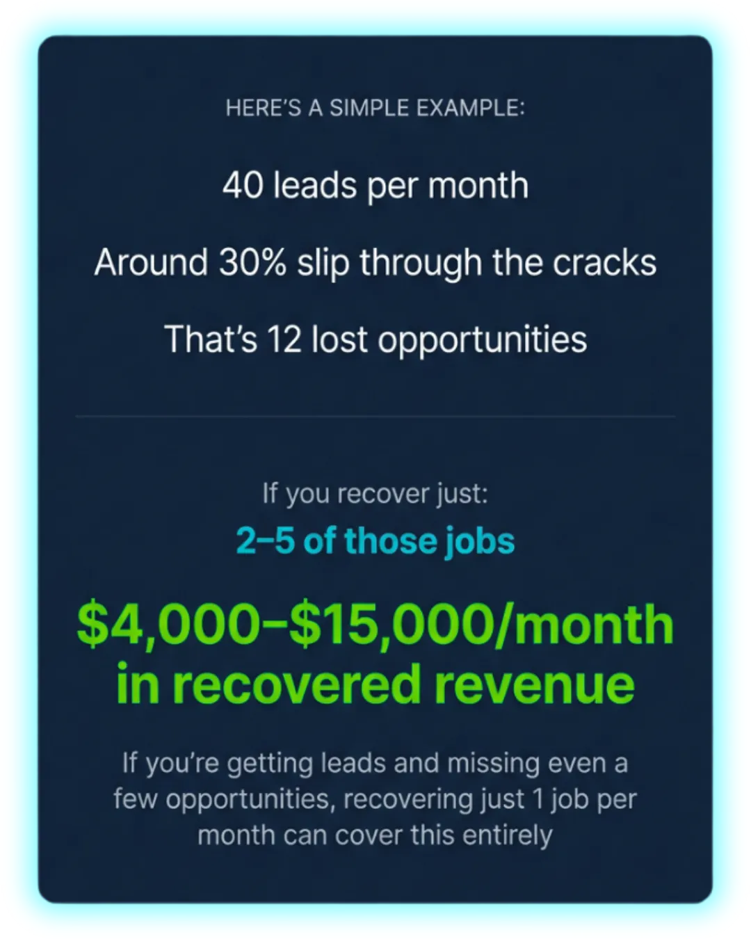 “I would have lost that… and probably the next one too.” This is happening across your entire pipeline, not just missed calls. This happens every day in your business.